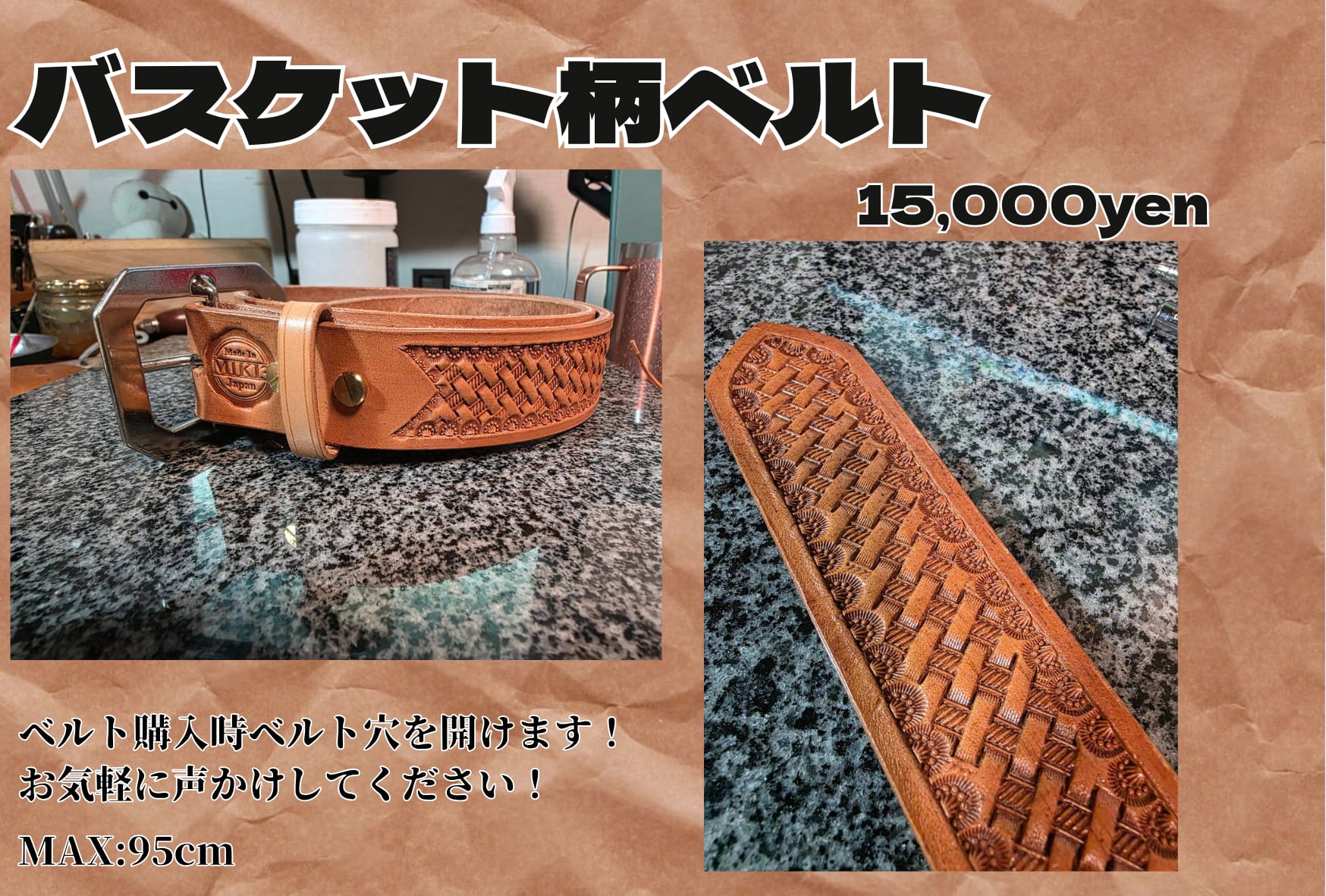 4mm厚の革で制作したMAX95㎝のバスケット柄ベルトです。